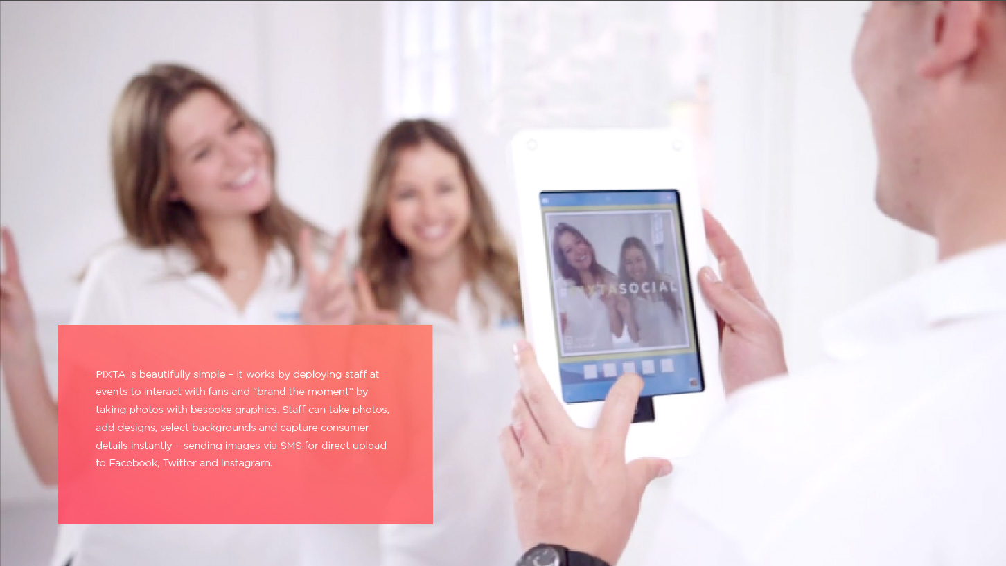 PIXTA is intuitively designed to enable fast staff training on a large scale. Within minutes, multiple staff can be trained and deployed into the field, creating uniquely branded content to be shared online as they engage fans on the go.